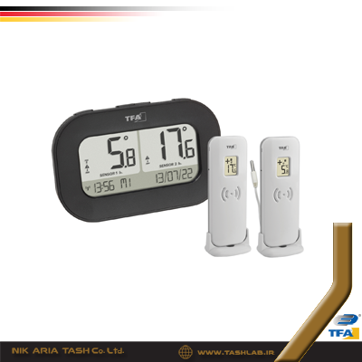 برد تبادل داده تا ۱۰۰ متر در فضای آزاد است که امکان مشاهده دمای محیط را از فاصله نسبتاً زیاد فراهم کرده و برای نظارت دمایی دقیق و موثر مناسب است TFA Dostmann. نمایشگر واحد اصلی این ترمومتر ساعت رادیویی دقیق همراه با نمایش تاریخ و روز هفته در شش زبان را نیز ارائه میدهد